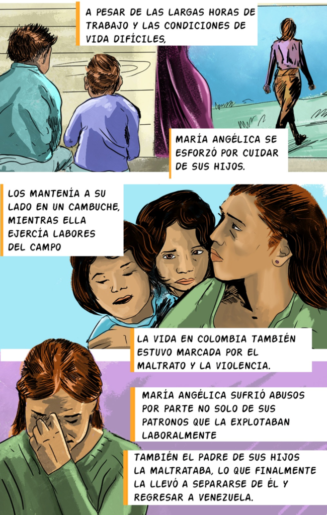 El papá de mis hijos se empezó a portar muy mal y un día me pegó tanto que me dejó inconsciente y me llevaron a la emergencia del hospital. Cuando salí no quise regresar a la finca, me quedé en Bucaramanga en la casa de una señora que me apoyó. Intenté trabajar de nuevo, pero era muy duro, no encontraba un empleo para poder pagar los gastos de manutención mía y de los niños.