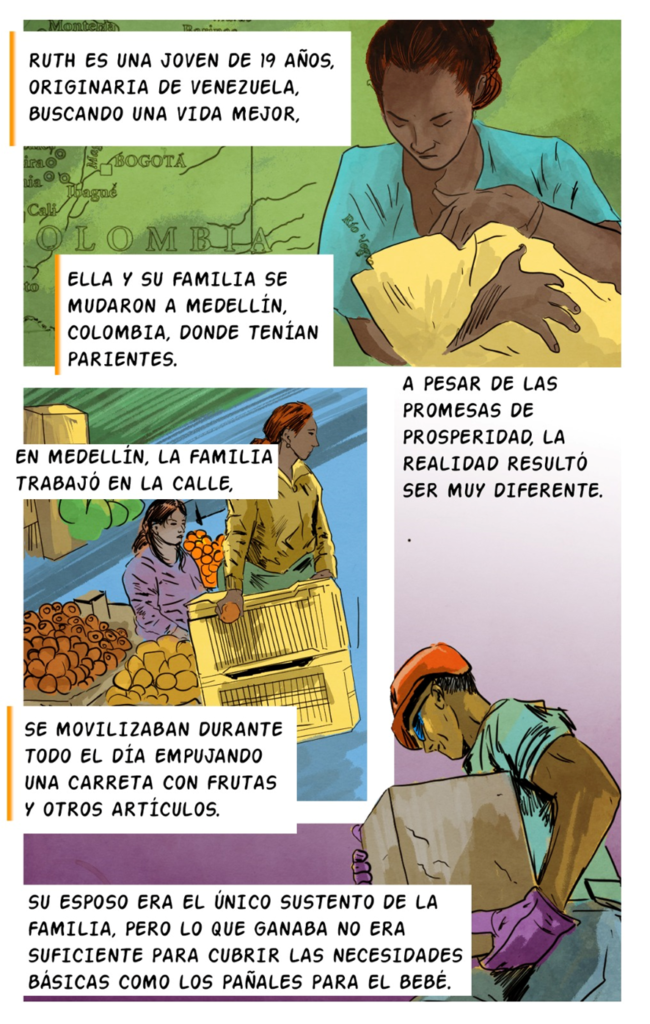 La primera vez que nos fuimos a Medellín fue en 2021. Yo estaba recién dada a luz, tenía 16 años, ahora tengo 19. Mi hermano estaba allá y me dijo: “Ruth me está yendo bien, vengan que yo les colaboro”. Nos dejamos llevar por ese comentario y nos fuimos el papá de mi bebé, la bebé y yo.