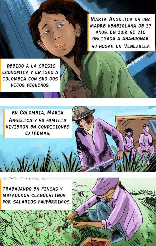 Esa misma mujer nos ofreció un trabajo en una finca, no muy lejos de Bucaramanga. Aparentemente era un buen trabajo porque ganaríamos más, pero fue un engaño. Nos tenían encerrados, como presos, no nos dejaban salir. Nos pagaban por el trabajo de los dos 100.000 pesos colombianos a la semana, unos 27 dólares al cambio. Trabajamos desde las cinco de la mañana hasta las cinco de la tarde, menos los domingos.